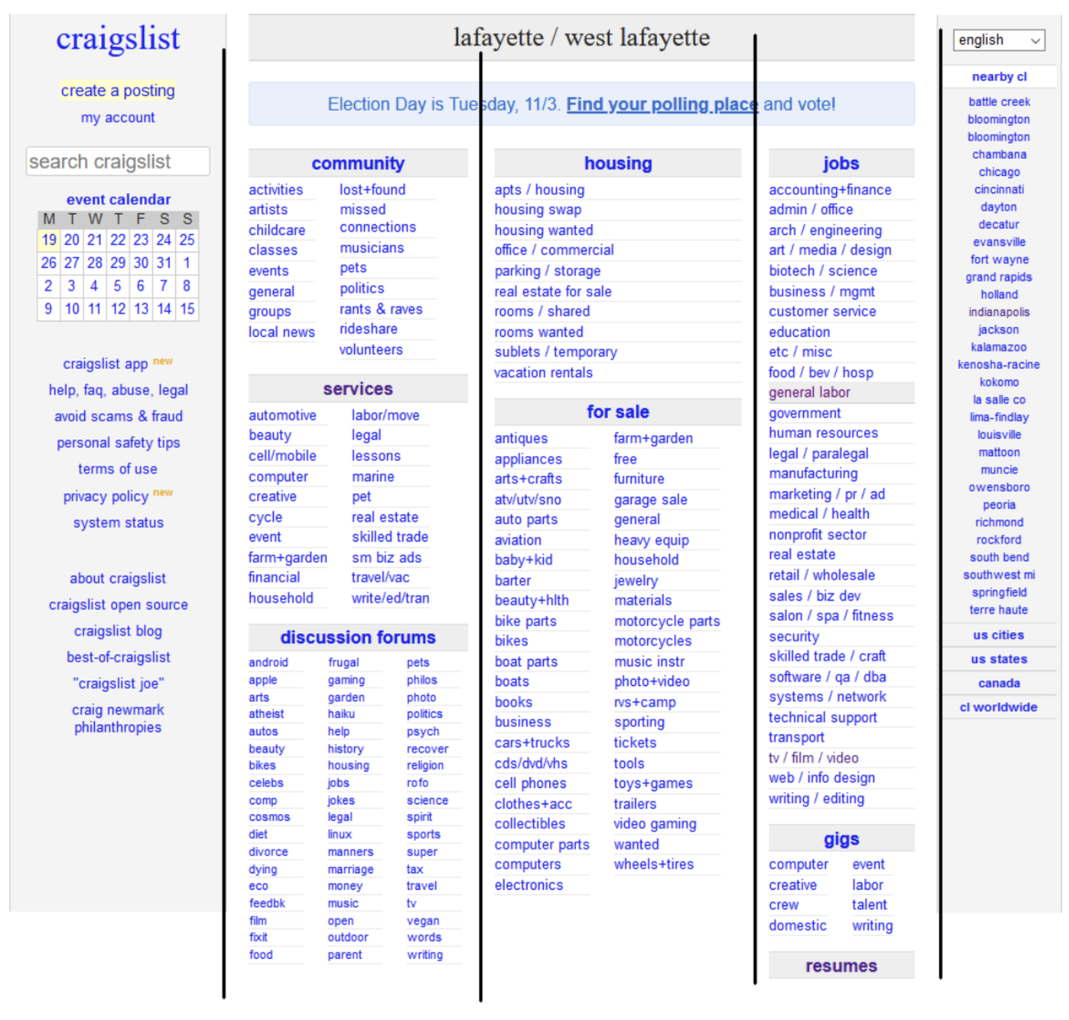 The purpose of an interface inventory is to assess the user interface elements of Craigslist and the basic grid that the information that the website is displaying is aligned to. The importance of this is to show the priorities of what Craigslist’s designers intended to show off.